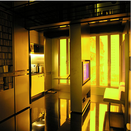 Κινούμενοι τοίχοι σε ράγες στην οροφή δίνουν τη δυνατότητα να φτιάξει κανείς πάνω από 20 διαρρυθμίσεις. Ενιαία κουζίνα, ιδιαίτερο υπνοδωμάτιο, ακόμα και οικιακό κινηματογράφο. Οι τοίχοι περιέχουν ή φέρουν συσκευές και χώρους (τηλεόραση, κουζίνα, ντουλάπες κ.ά.).